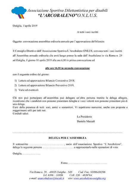 02/04/2019Mercoledì 10 aprile alle ore 16,00 presso la sede dell'Associazione in Via Roma n. 29, si terrà l'annuale assemblea dei soci per...